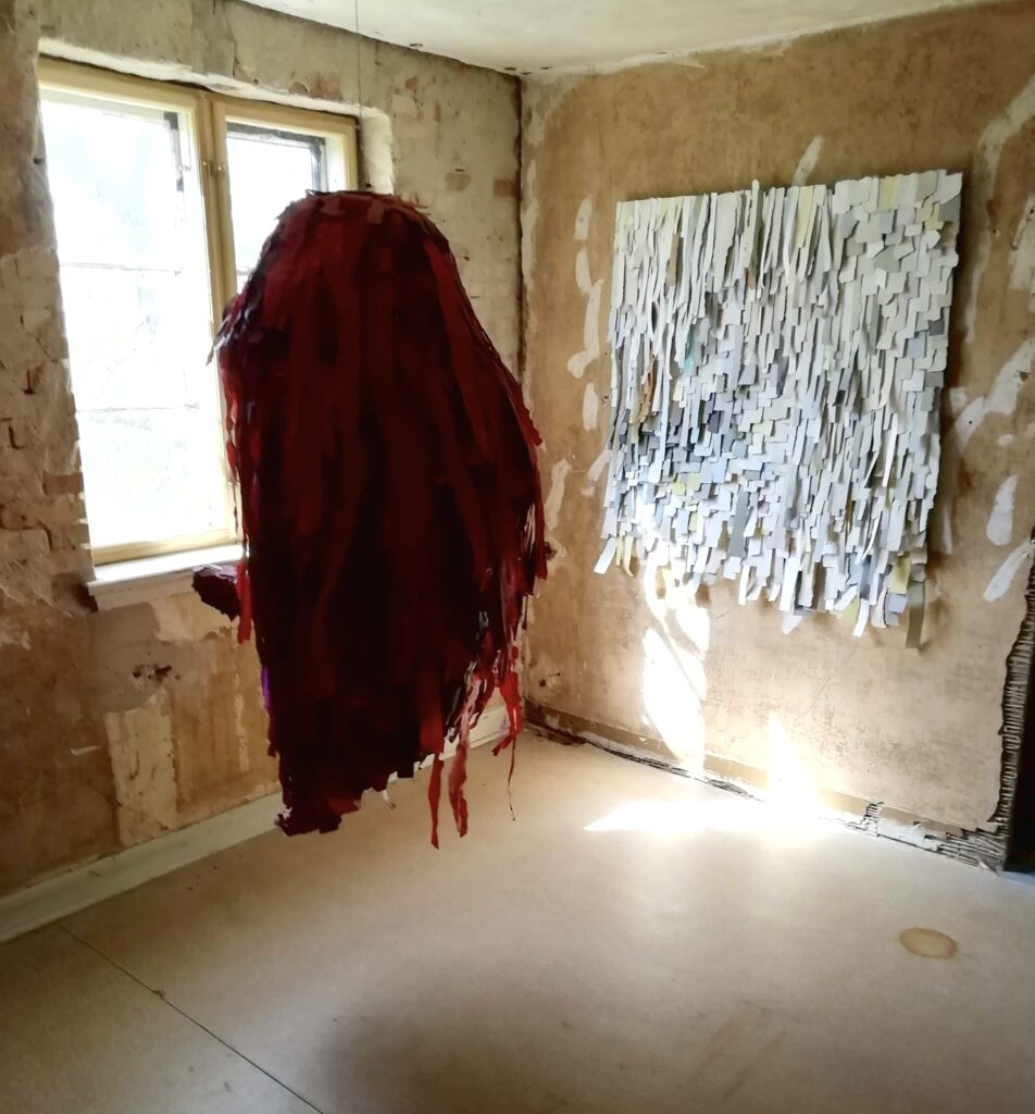 Mobile, papier maché, glue painting, wire. 120 x 100 x 200 cm. Tinghuset, Ebeltoft, 2025